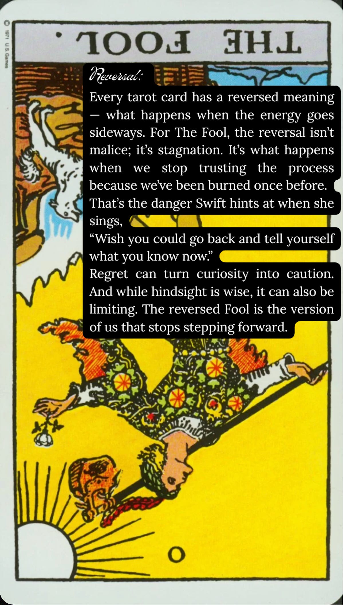 It’s easy, with adult hindsight, to laugh at teenage optimism. But Swift doesn’t mock that girl. She honors her. Because The Fool isn’t wrong for trusting, she’s only wrong if she refuses to learn when she lands.